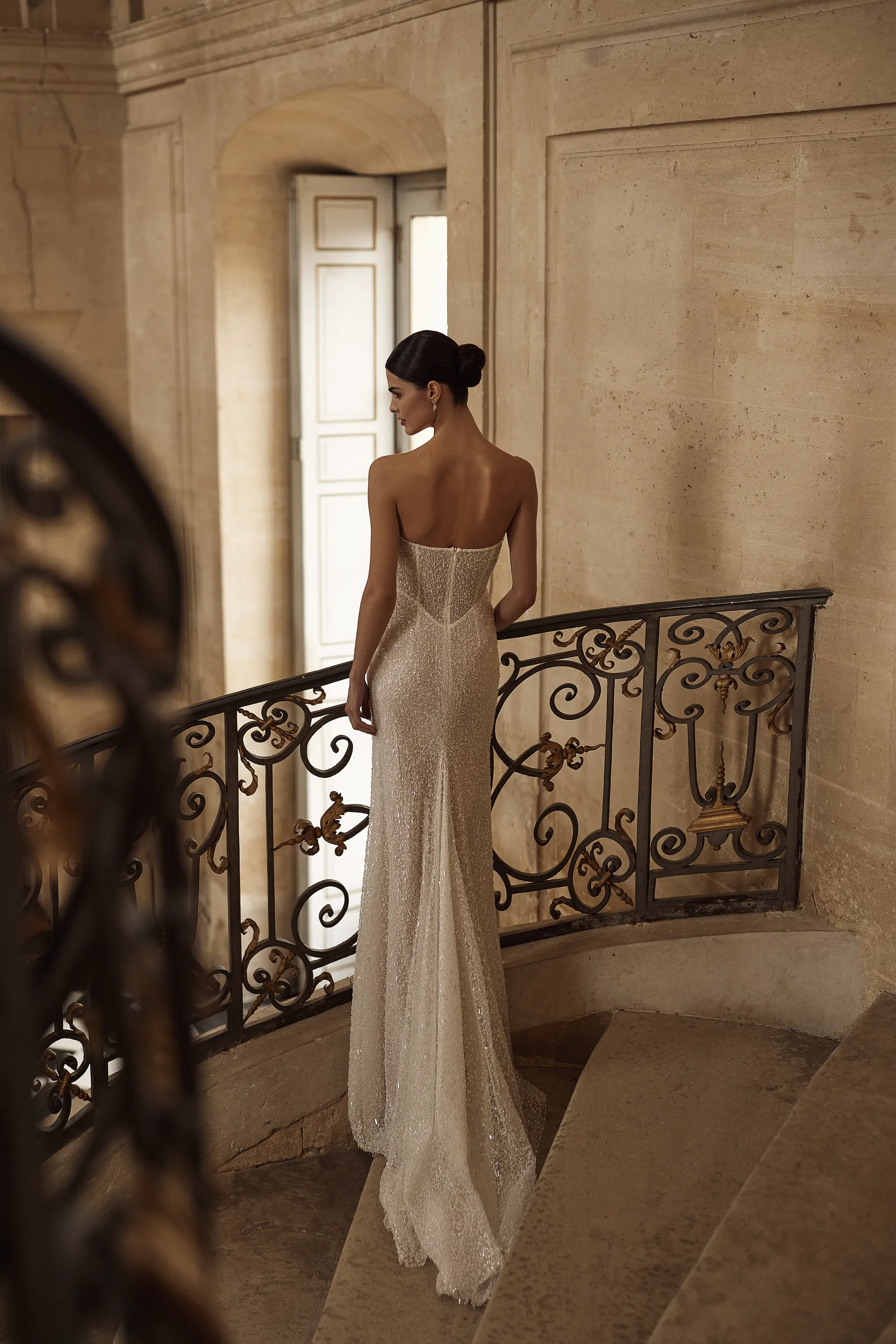 Elegantna venčanica sirena kroja izrađena od čipke koja blista zahvaljujući desetinama diskretnih šljokica. Model ima srcoliki izrez, strukturirani korset sa ugrađenim korpama koji savršeno oblikuje figuru, kao i rajsferšlus kopčanje na leđima. Donji deo čini uska maxi suknja sa kratkim šlepom, koja dodatno naglašava elegantnu siluetu.